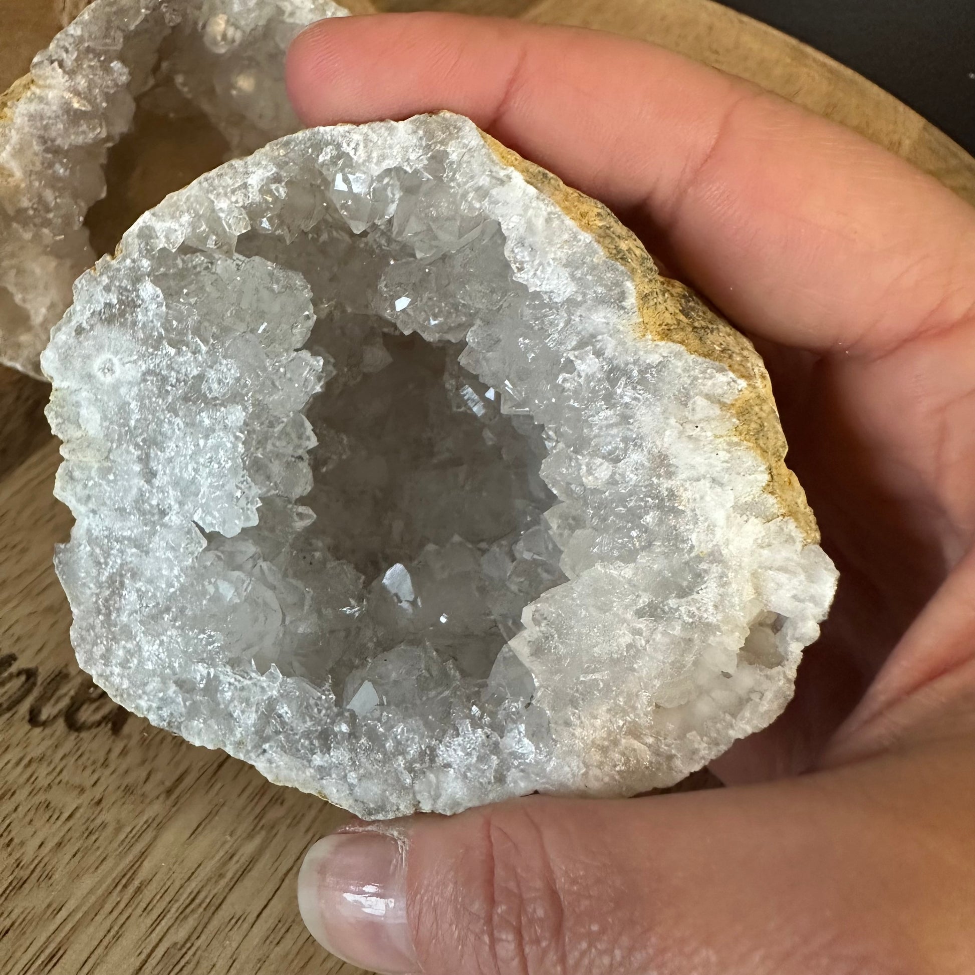 Passez délicatement votre géode de Cristal de Roche sous un filet d’eau claire, en posant une intention de purification.